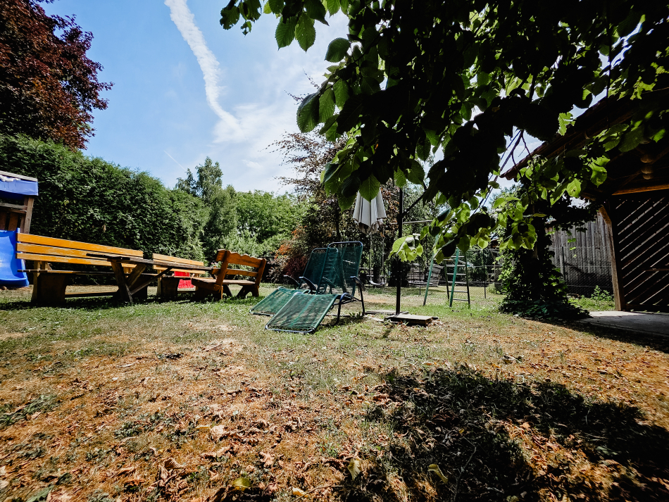 - Eine schöne und große Liegewiese mit Liegemöglichkeiten und Gartenpavillion