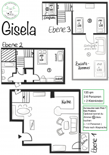1 Schlafzimmer mit Doppelbett und 2 Kinderbetten, 1 Schlafzimmer mit 2 Einzelbetten, 1 Schlafnische mit Doppelbett (über einer Leiter erreichbar), großer Wohn-, Koch- und Essbereich. In der Gisela gibt es die Möglichkeit, ein zusätzliches Zimmer mitzubuchen, dass sich ans obere Schlafzimmer anschließt. Dort gibt es ein Doppelbett (140 cm) und eine Schlafcouch.