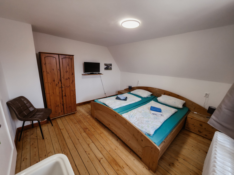 1 Schlafzimmer mit großem Doppelbett, 1 Schlafzimmer mit zwei Doppelstockbetten (untere Liegefläche 1,40 m), 1 großer Wohn-, Essbereich mit offener Küche.