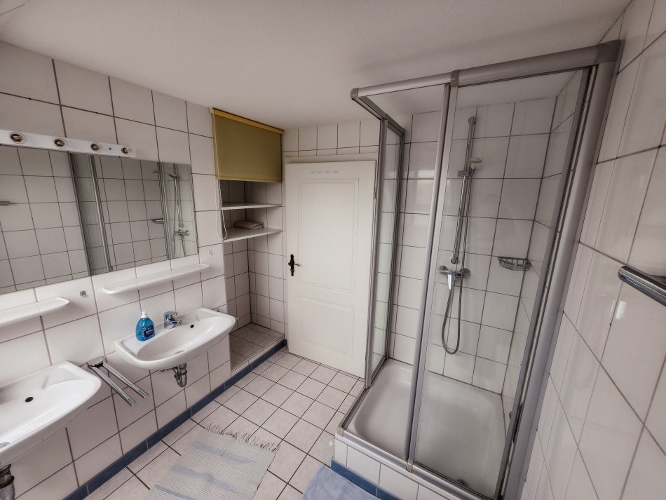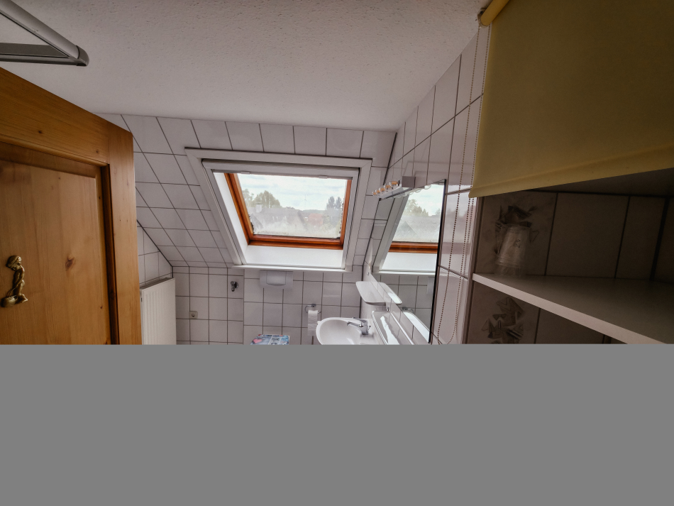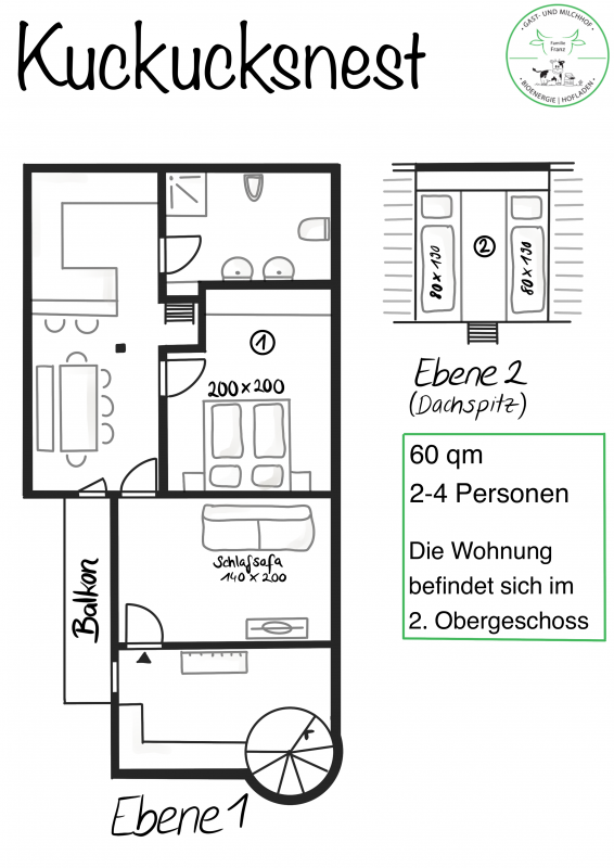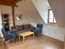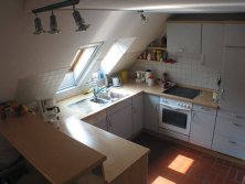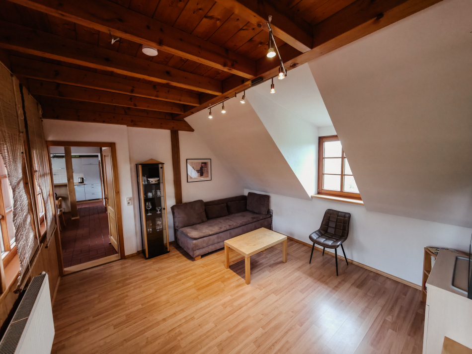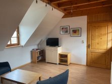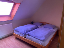 Ein Schlafzimmer mit Doppelbett, ein Schlaf-/ Wohnzimmer mit Schlafsofa, 2 Einzelbetten (1,90x0,80m) gemütlich im Dachgiebel eingebettet und über eine Leiter erreichbar (deshalb für ältere Gäste nicht geeignet) und ein Esszimmer mit offener Küche.